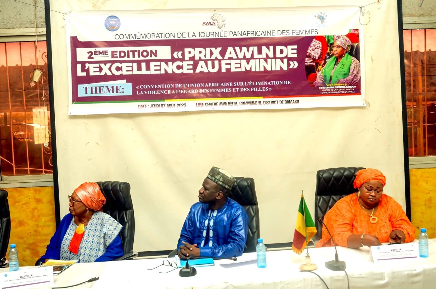 Dans le cadre de la célébration de la Panafricaine des femmes, édition 2025, le chapitre malien du « Réseau des femmes leaders africaines » ( AWLN / MALI) a organisé ce 7 août, au Centre Aoua Keita, une conférence-débat sur « La Convention de l’Union Africaine sur l’élimination de la violence á l’égard des femmes et des filles ». Les deux lauréates du prix AWLN 2025 sont Bouaré Bintou Founé Samaké, ancienne ministre et présidente de WILDAF et Fatoumata Maïga présidente de AFIP. Elles reçoivent ces prix  d’excellence pour la lutte contre les violences faites aux femmes et pour le combat pour l’instauration de la paix et la sécurité.