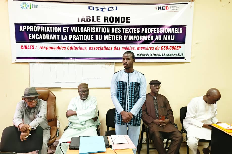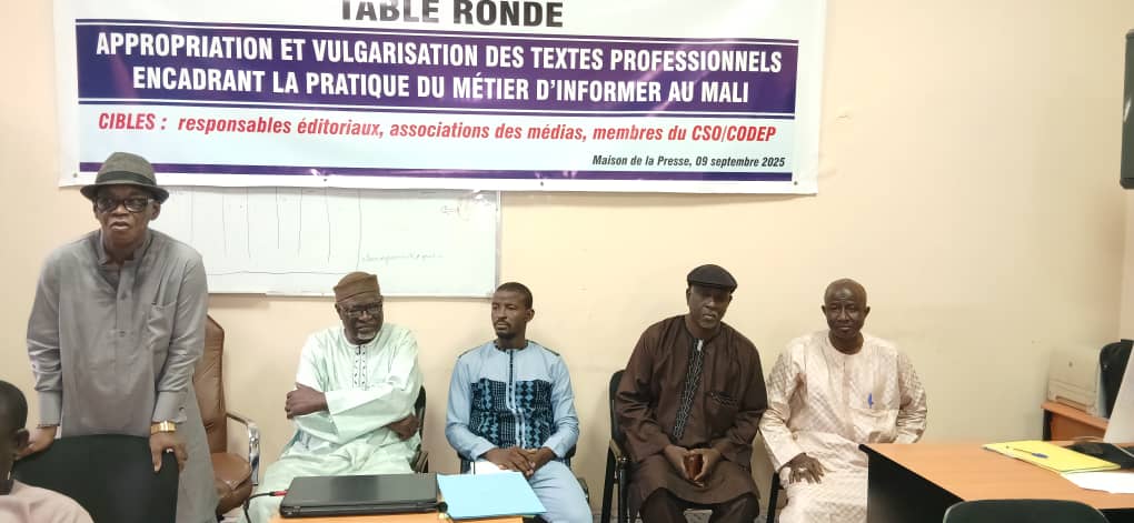 La Maison de la presse a abrité le 9 septembre 2025, une table ronde des acteurs de médias, sur l’appropriation et la vulgarisation des textes professionnels, encadrants la pratique du métier d’informer au Mali. La table ronde est organisée grâce au partenariat de l’organisation canadienne, Journalistes Droits Humains (JDH ) et IDM( Institut pour la démocratie et l’éducation aux médias). C’est dans le cadre du projet « Lutte contre la désinformation et les discours de haine pour renforcer les droits humains et la bonne gouvernance au Mali » de JDH.